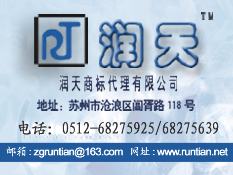 蘇州潤(rùn)天商標(biāo)事務(wù)所0512-68275925是國(guó)家商標(biāo)局在蘇州地區(qū)專業(yè)從事商標(biāo)注冊(cè)申請(qǐng)、續(xù)展、轉(zhuǎn)讓、商標(biāo)監(jiān)測(cè)、知識(shí)產(chǎn)權(quán)訴訟、蘇州軟件著作權(quán)登記\蘇州版權(quán)登記代理等知識(shí)產(chǎn)權(quán)服務(wù)的專門(mén)機(jī)構(gòu)。條形碼登記代理|蘇州商標(biāo)申請(qǐng)|蘇州商標(biāo)代理|昆山商標(biāo)代理|蘇州商標(biāo)|蘇州商標(biāo)注冊(cè)|蘇州商標(biāo)|知識(shí)產(chǎn)權(quán)訴訟代理|蘇州商標(biāo)注冊(cè)公司|吳江商標(biāo)注冊(cè)公司|太倉(cāng)商標(biāo)注冊(cè)|太倉(cāng)商標(biāo)注冊(cè)申請(qǐng)|太倉(cāng)商標(biāo)注冊(cè)公司|昆山商標(biāo)注冊(cè)公司|吳江商標(biāo)注冊(cè)公司|商標(biāo)轉(zhuǎn)讓申請(qǐng)|商標(biāo)續(xù)展申請(qǐng)|商標(biāo)設(shè)計(jì)|蘇州LOGO設(shè)計(jì)|商標(biāo)查詢|商標(biāo)免費(fèi)查詢|蘇州工業(yè)園區(qū)商標(biāo)注冊(cè)|蘇州新區(qū)商標(biāo)注冊(cè)蘇州商標(biāo)公司|蘇州商標(biāo)注冊(cè)|蘇州商標(biāo)代理公司|蘇州商標(biāo)事務(wù)所|蘇州商標(biāo)注冊(cè)公司|蘇州商標(biāo)設(shè)計(jì)|蘇州商標(biāo)代理|蘇州商標(biāo)網(wǎng)|蘇州商標(biāo)注冊(cè)事務(wù)所|蘇州商標(biāo)注冊(cè)流程|蘇州潤(rùn)天商標(biāo)代理有限公司0512-68275925|0512-68275639聯(lián)系電話:13812645181|聯(lián)系人:康秀|網(wǎng)址:WWW.RUNTIAN.NET |