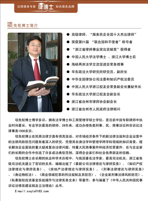 浙江新臺州律師事務(wù)所成立于1998年,是一家大型綜合性法律服務(wù)機(jī)構(gòu)。以杭州為管理中心,在臺州、上海、北京設(shè)有分所或辦事機(jī)構(gòu),服務(wù)范圍輻射長三角地區(qū)。 本所榮獲“浙江省省級優(yōu)秀律師事務(wù)所”、“服務(wù)民營企業(yè)全國優(yōu)秀律師事務(wù)所”等榮譽(yù)稱號。主任項(xiàng)先權(quán)博士以其浙江大學(xué)工商管理碩士、中國人民大學(xué)法學(xué)博士、浙江大學(xué)博士后的教育背景及從業(yè)26年深厚的專業(yè)功力,在國內(nèi)法學(xué)界享有很高的聲望。他帶領(lǐng)專業(yè)法律服務(wù)團(tuán)隊(duì)取得了良好的業(yè)績與榮耀,獲得了社會的充分認(rèn)可與褒揚(yáng)。先后榮獲“浙江省律師事業(yè)突出貢獻(xiàn)獎”、“服務(wù)民營企業(yè)全國十大杰出律師”、“聯(lián)合國和平使者”等諸多榮譽(yù)稱號。 本所下設(shè):婚姻家庭法律部、刑事辯護(hù)法律部、訴訟仲裁部、公司證券事務(wù)部、知識產(chǎn)權(quán)事務(wù)部、建筑房地產(chǎn)事務(wù)部、企業(yè)法律顧問部、律博士會員服務(wù)中心等專業(yè)服務(wù)部門。 感謝您對浙江新臺州律師事務(wù)所(杭州所)的支持與關(guān)心! 如有法律咨詢、業(yè)務(wù)委托或欲進(jìn)一步獲取有關(guān)信息,請與我們聯(lián)系: 杭州辦公地址 浙江省杭州市西湖區(qū)文三路369號文三數(shù)碼大廈12層1201室(浙江省檢察院與國土資源局中間) 郵編:310012 傳真:0571-88930756 聯(lián)系人:李律師 手機(jī):13656813663 辦公:0571-56883853 :676809687 群:杭州法律咨詢?nèi)海?26880116)、杭州律師咨詢?nèi)海?11658091) E-MAIL: [email protected] 網(wǎng)址:://WWW.TZ-LAWYER.COM